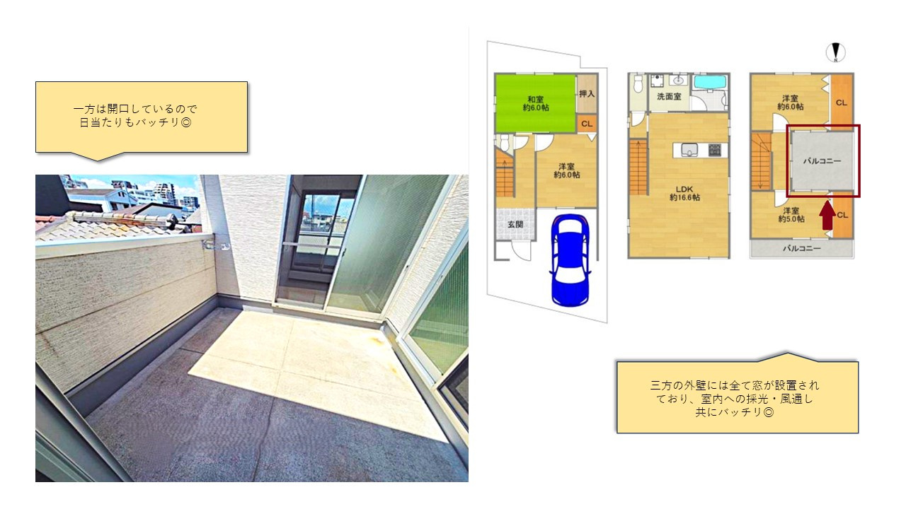 ◎レイアウトの工夫:バルコニーが他の部屋に囲まれる形にすることで、中庭風の雰囲気が強調されます。この際、部屋からの視線やバルコニーとの距離感を計算し、窮屈にならないように設計することがポイントです。