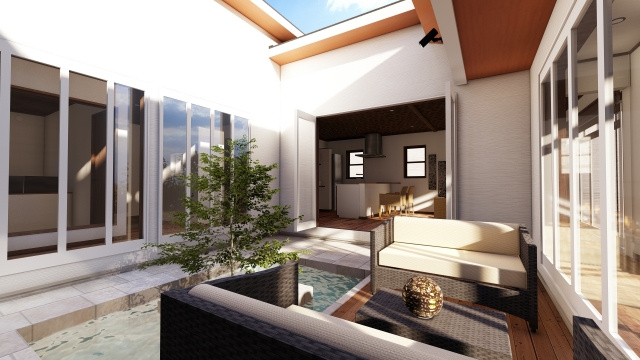 ◎開口部の配置:プライバシーを保ちながら外部と適度に繋がるように、一部分に開口部や窓を設置します。例えば、一方のみ柵や手すりにすることで外部と緩やかに繋がり、中庭の閉塞感が軽減されます。