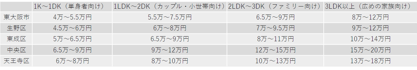 一人暮らしを始める方々にとって、物件探しは大きなステップです。今回ご紹介する東大阪市、生野区、東成区、中央区、天王寺区にはそれぞれ異なる魅力があります。今回は家賃相場、人気層、各エリアのおすすめポイントを詳しくお伝えします。自分に合った物件選びの参考にして理想の住まいを見つけましょう。